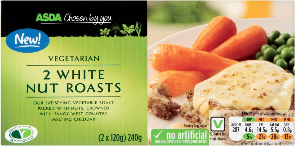 Asda Vegetarian White Nut Roasts blurb reads: No artificial colours, flavours or hydrogenated fat. Vegetarian Society approved. Parsnips, cauliflower, pearl barley and mushrooms with chestnuts, cashews, peanuts, almonds and walnuts topped with mature cheddar.