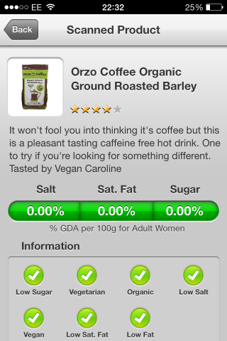 Freshly brewed this has a good roasted aroma. It doesn’t have the complexity of coffee but it’s got nice toasty flavours and some pleasant bitterness. It’s the first time that I’ve seen a roasted barley product like this which isn’t instant though they do make an instant version as well. I love the process of making coffee so it appealed to me that I could make this in the same way – with a filter, cafetiere, stove top espresso maker etc. I decided to give up coffee for February so this has been a great discovery and one that I’ll carry on drinking when I’m looking for a caffeine alternative. I especially liked that I could enjoy this as a bedtime drink. I liked the taste best when paired with a sweetened, vanilla heavy type of soya milk.
