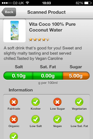 Not to be confused with coconut milk, this product comes from the liquid inside young green coconuts not the brown hairy ones. It’s low in calories but high in electrolytes and is marketed as a fat free, low calorie way to stay hydrated. It’s become widely available in the last year with many people using it as an alternative to sugar and caffeine heavy energy drinks. I’ve been drinking this stuff for a few years and am delighted that it’s so easy to find these days. At one time I could only get it from stalls selling fresh coconuts at vegan or raw food fairs which would be hacked open with a machete and a straw inserted! Now it’s available in cartons in lots of newsagents and convenience stores.