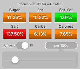 The live traffic lights are calculated for your personal reference intake (RI based on your settings’ information) and will alter when you move the graduated scale. Standard back label values per 100g or 100ml are pretty useless when you are using just a shake or scrape.